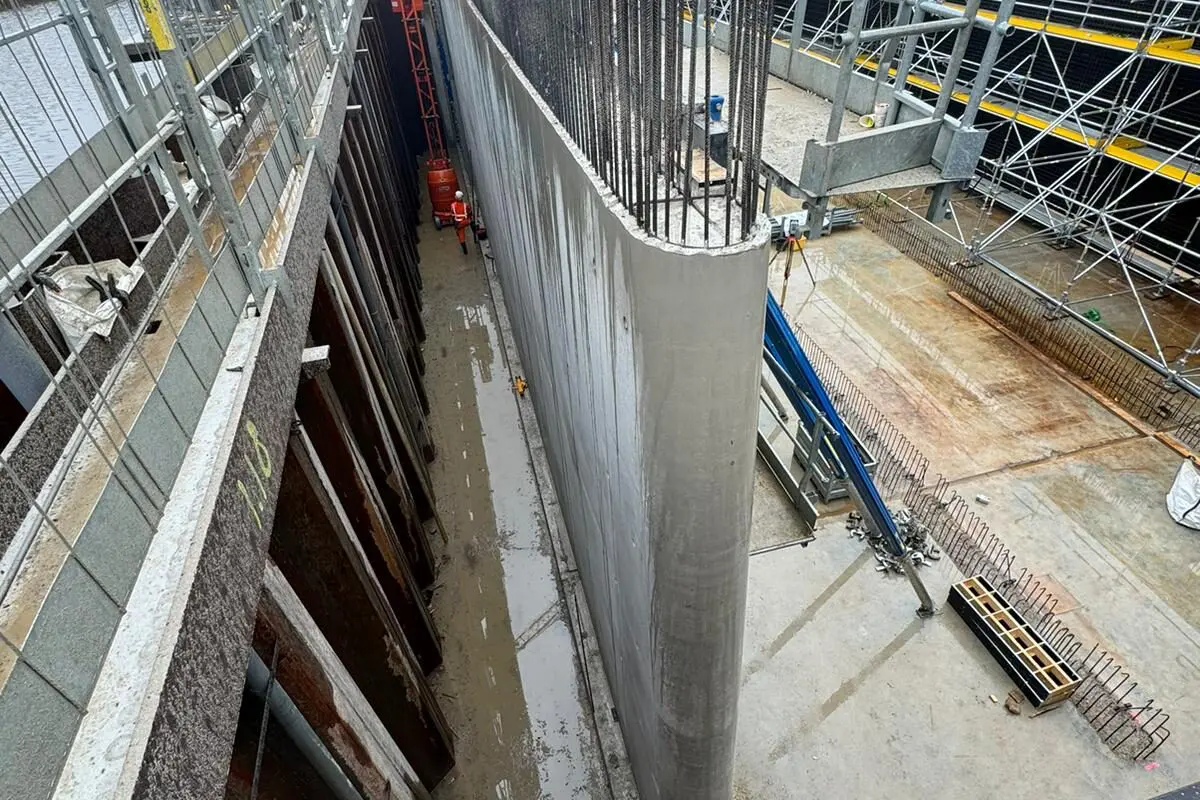 “Om de monumentale sluis niet te beschadigen, hebben we vrijwel alle damwanden voor de bouwkuip van het gemaal trillingsvrij gedrukt”, vertelt projectmanager Marcel Kampman. “De funderingspalen zijn trillingsvrije boorpalen. Daarmee hebben we het risico op zettingen voorkomen. Uiteraard monitoren we continu. De bouwkuip staat nu mooi droog. We zijn bezig met de vloeren en de wanden en daarna storten we het dek van het gemaal.”