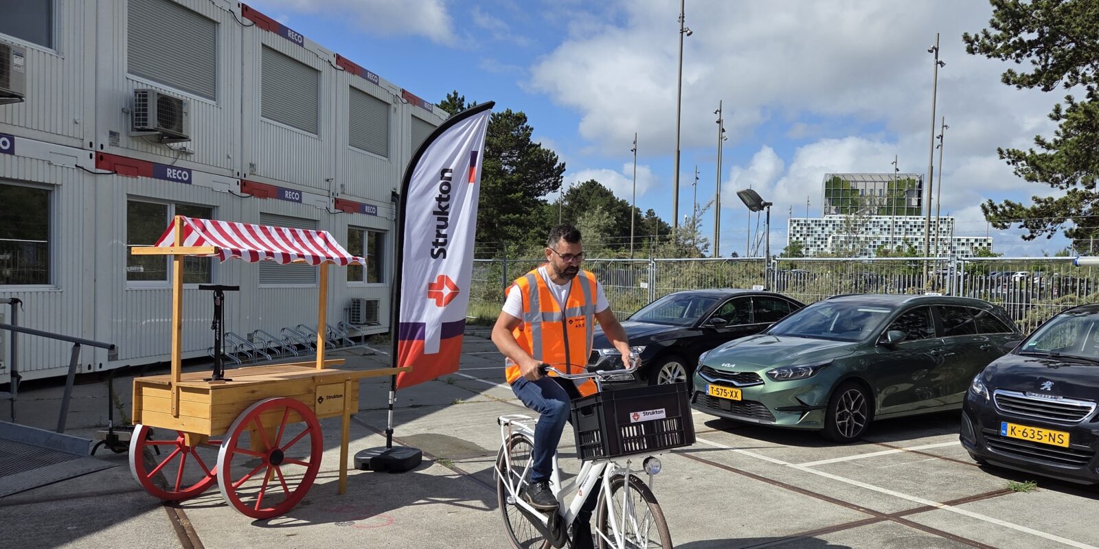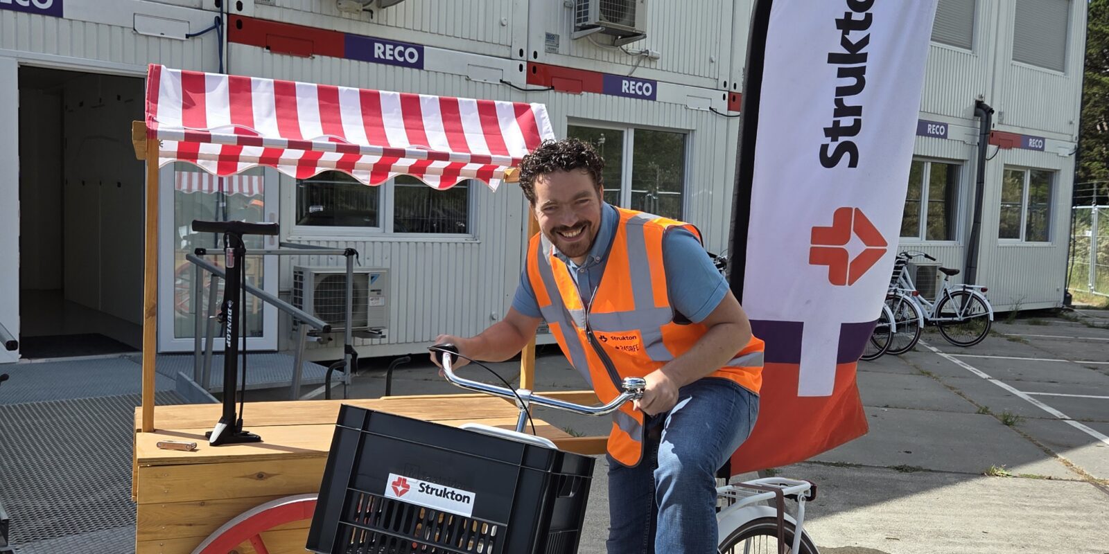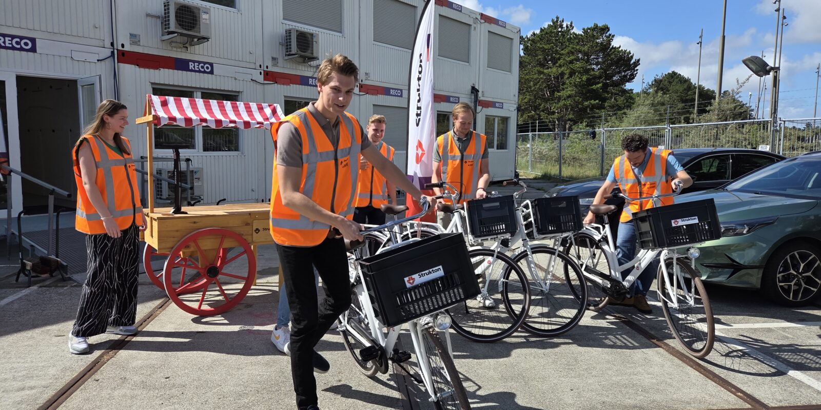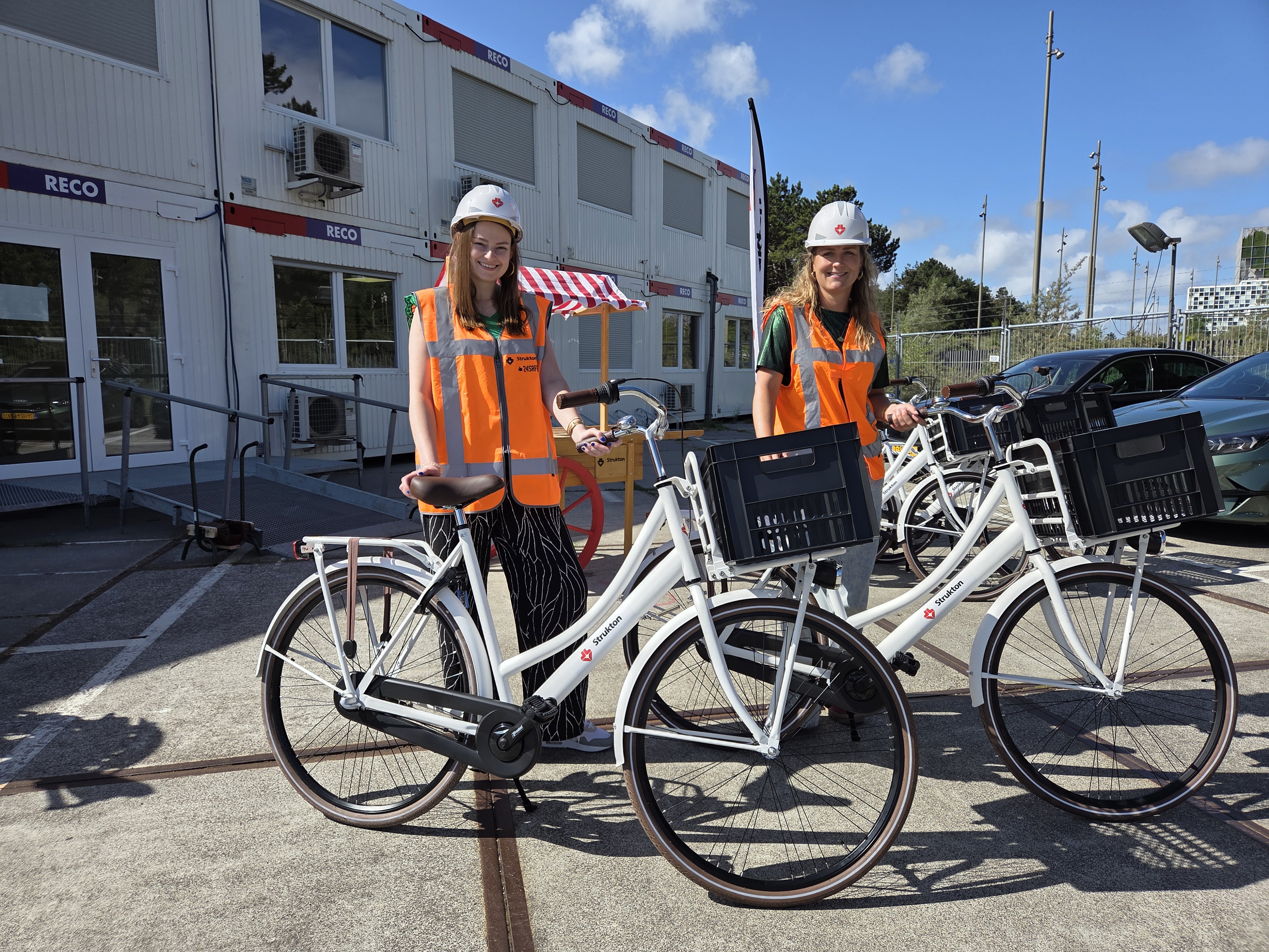 Elke fiets is uitgerust met een krat, stevig slot en krijgt een herkenbare witte kleur met duidelijke Strukton-logo’s. We gebruiken ze om gemakkelijk te reizen tussen de drie bouwlocaties en de keet. Daarbij kregen we ook een fietspomp en multitool voor het kleine onderhoud.