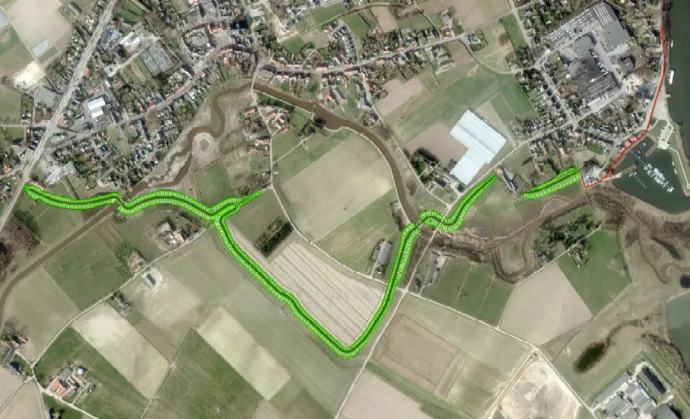 We hebben de kering verhoogd en vervangen, inclusief nieuwe coupures, en infrastructuur aangepast. Om droge voeten te houden hebben we de ruim 1.600 meter lange dijk opgehoogd en deze plaatselijk verlegd. Ook pasten we twee stuwtjes aan. In plaats van de zo’n 500 meter lange keermuur kwam een nieuwe hogere harde kering, die deels uit glazen panelen bestaat. In deze muur bevinden zich ook doorgangen (coupures). Deze hebben we vervangen en voorzien van nieuwe keermiddelen. Bij een nieuwe kering hoort in dit geval ook aangepaste infrastructuur. We zorgden voor het inrichten van percelen van particulieren en hebben het verleggen en aanpassen van kabels en leidingen gecoördineerd.